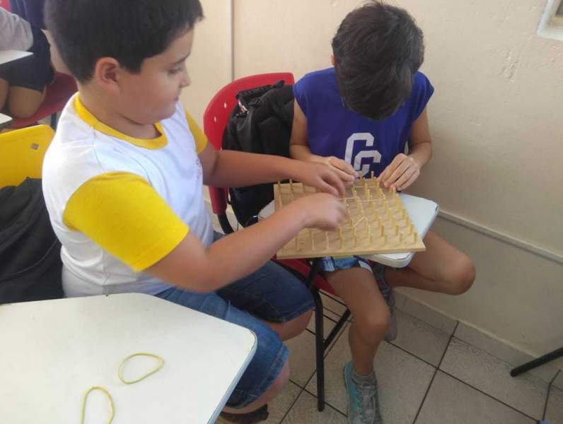 Os alunos do 4° ano do ensino fundamental I estão aprendendo a calcular o perímetro de formas geométricas, hoje foi o dia de trabalhar com o auxílio do geoplano, explorando a construção. Eles se dedicaram muito para ver qual dupla conseguia calcular o perímetro das figuras.