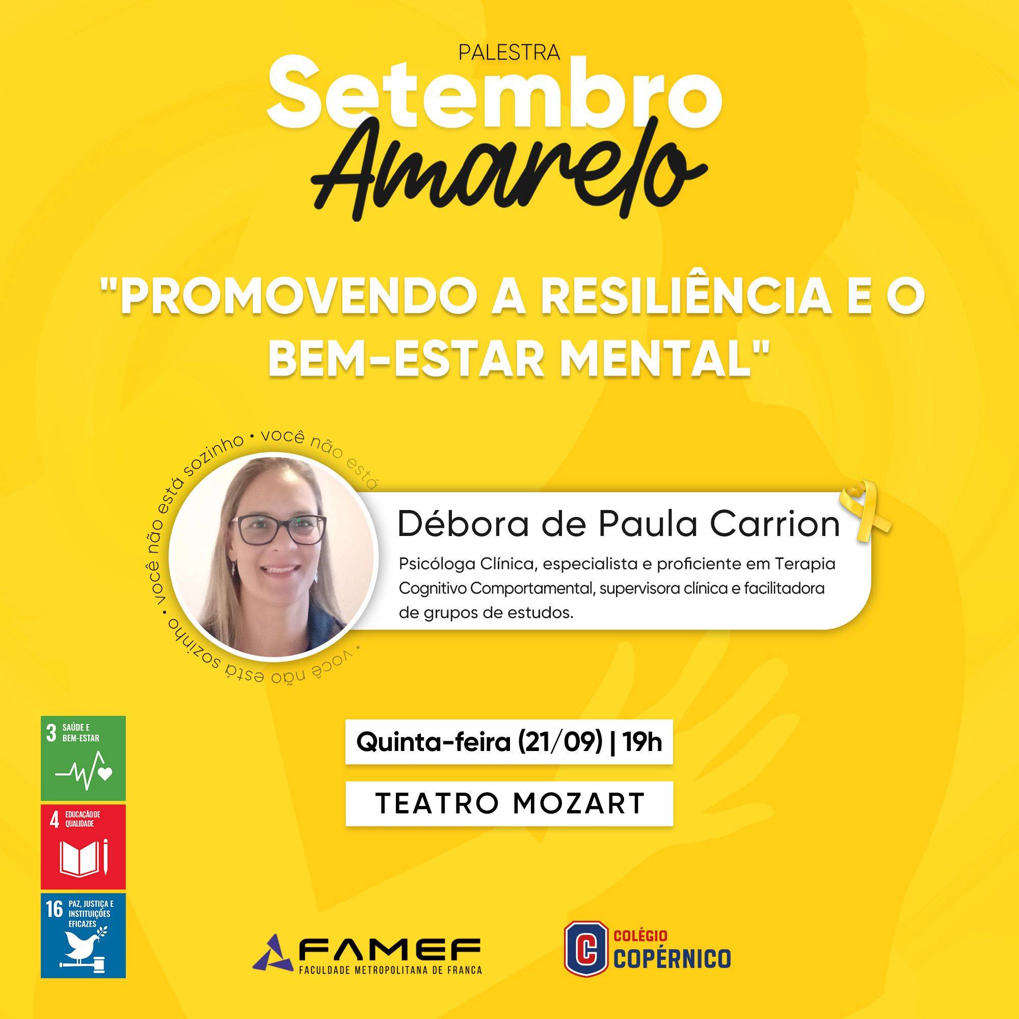 Em apoio ao Setembro Amarelo - Mês de Prevenção ao Suicídio, o Colégio Copérnico em parceria com a FAMEF, realizará a palestra "Promovendo a resiliência e o bem-estar mental".