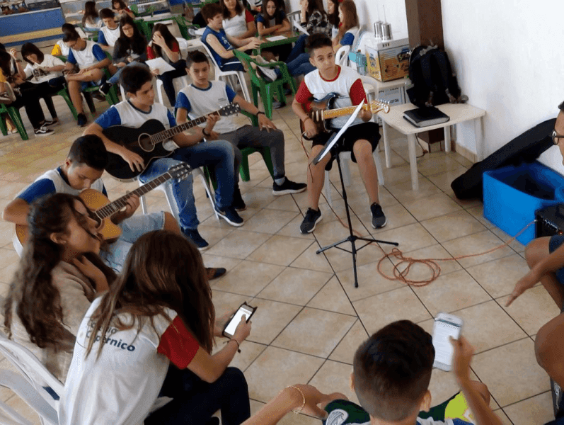 Os alunos do 8º ano do ensino fundamental do Colégio Copérnico em aula de sincronização de instrumentos em compassos mínimos.