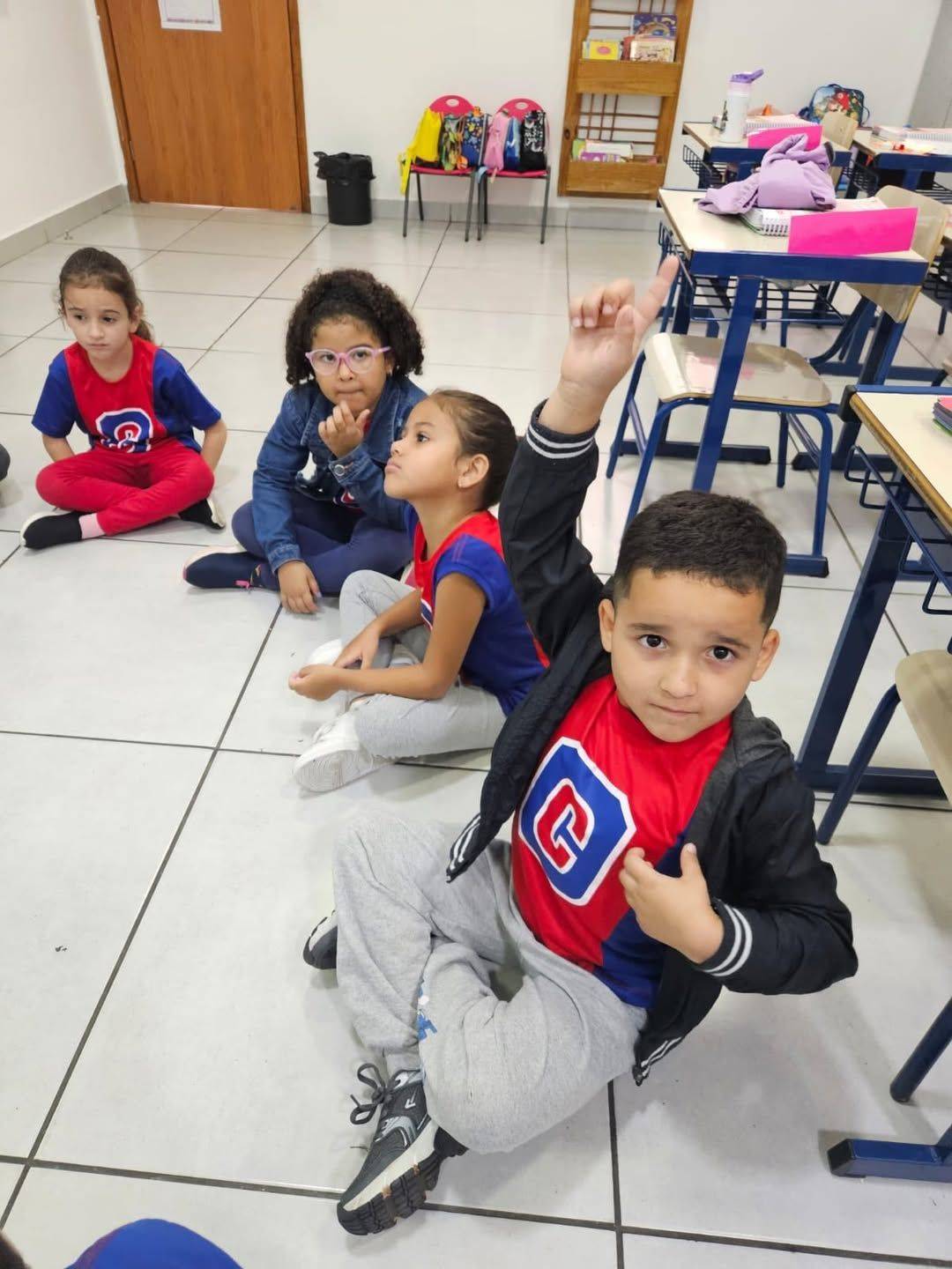 Durante o “Super Desafio das Sílabas”, cada estudante foi incentivado a pensar e dizer uma palavra que começasse com a mesma sílaba do seu nome, estimulando a consciência fonológica de forma lúdica e participativa.