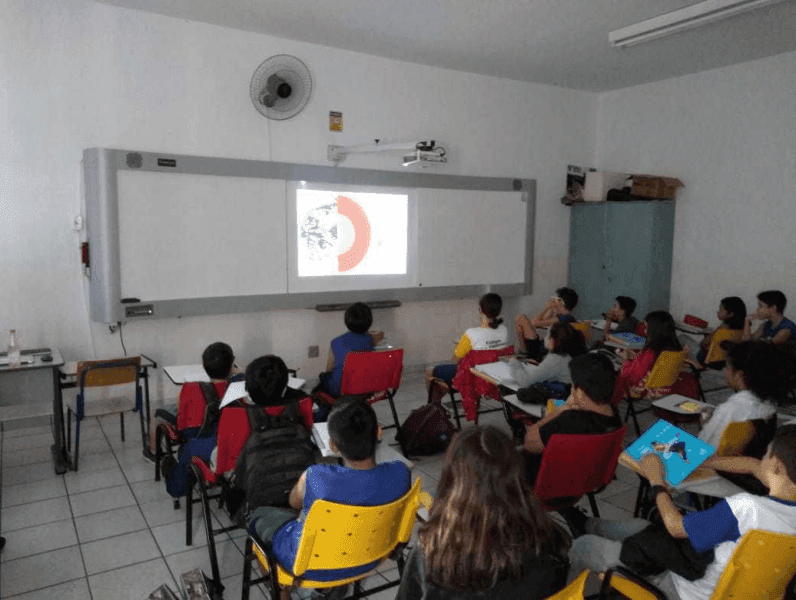Com o auxílio da lousa digital eles descobriram através de animações o poder interno da Terra. Professora Tamiris.