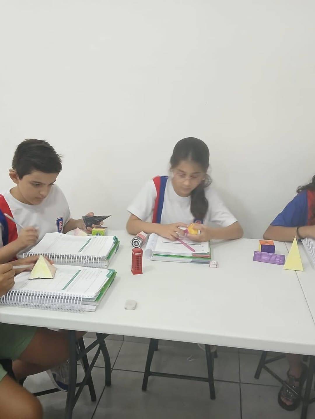 Durante a aula, identificaram formas como cubo, esfera e cilindro em objetos do cotidiano e, em seguida, construíram seus próprios sólidos, explorando conceitos como faces, arestas e vértices.