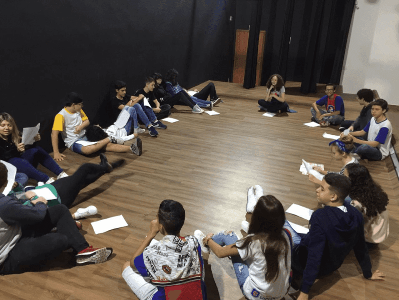 Alunos do 9° ano na aula de português fizeram a leitura do conto “Tentação” (Clarice Lispector). Logo em seguida fizeram uma roda de discussão sobre o tema para criarem os seus próprios contos a partir do tema proposto no conto da autora. Utilizaram o espaço descontraído do teatro para desenvolver melhor a imaginação. Prof. João Carlos