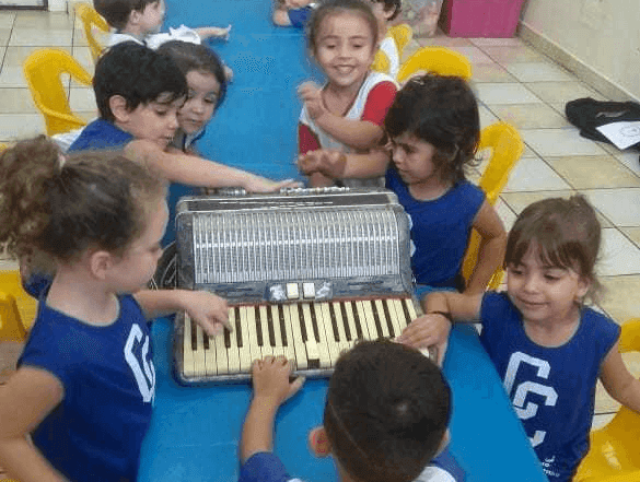 Nas aulas de música da Educação Infantil, os alunos conheceram e tocaram na sanfona, instrumento que era usado por Luiz Gonzaga em suas composições e apresentações. Os pequenos tiveram contato com um pouco mais da história do Rei do Baião e sua importância na cultura das Festas Juninas.