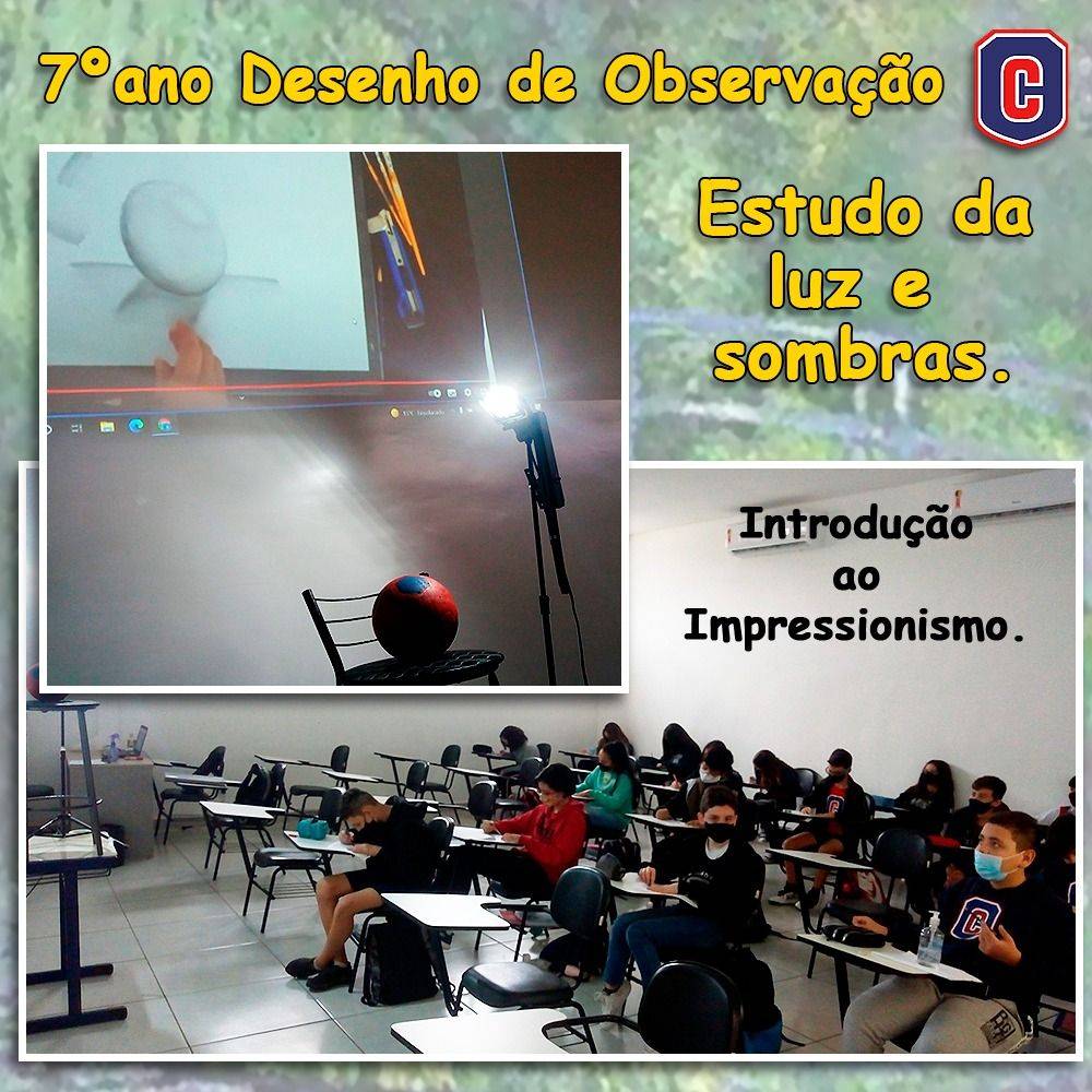 Os alunos do 7º ano estudam a importância da luz e sombras nas artes, dando introdução ao Impressionismo. A luz é parte da projeção dos objetos dentro das obras, segundo a pesquisa em que eles mesmos buscaram. Aula de Arte Professor Robson Bastos – Colégio Copérnico/2021