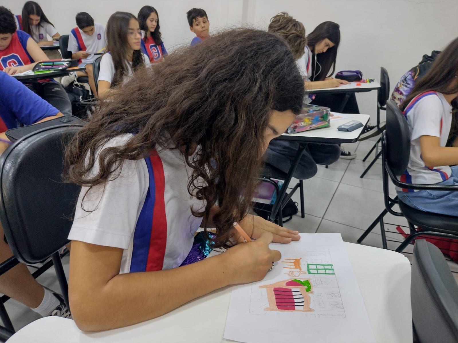 Os estudantes do 7º ano capricharam na pintura de desenhos da obra “Quarto em Arles” de Vicent van Gogh. A atividade, ponto de partida para uma roda de conversa sobre percepção, foi realizada após a descrição da famosa tela.