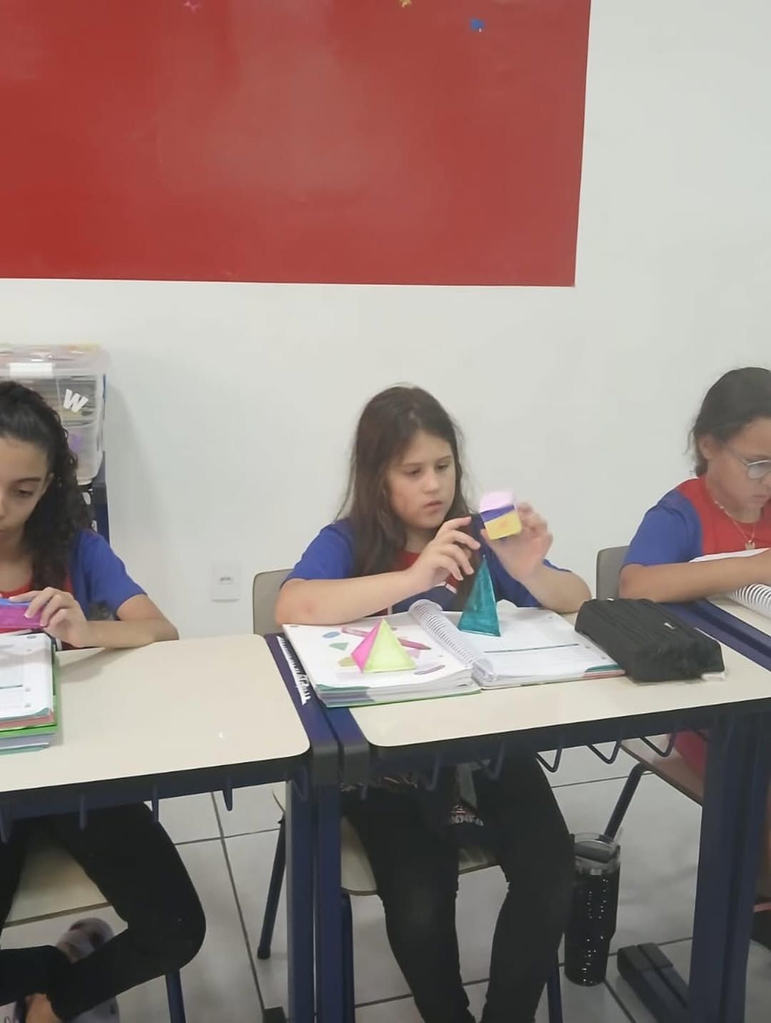 Durante a aula, identificaram formas como cubo, esfera e cilindro em objetos do cotidiano e, em seguida, construíram seus próprios sólidos, explorando conceitos como faces, arestas e vértices.