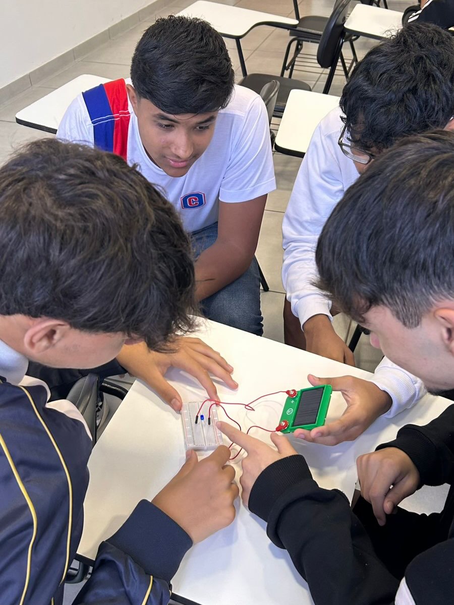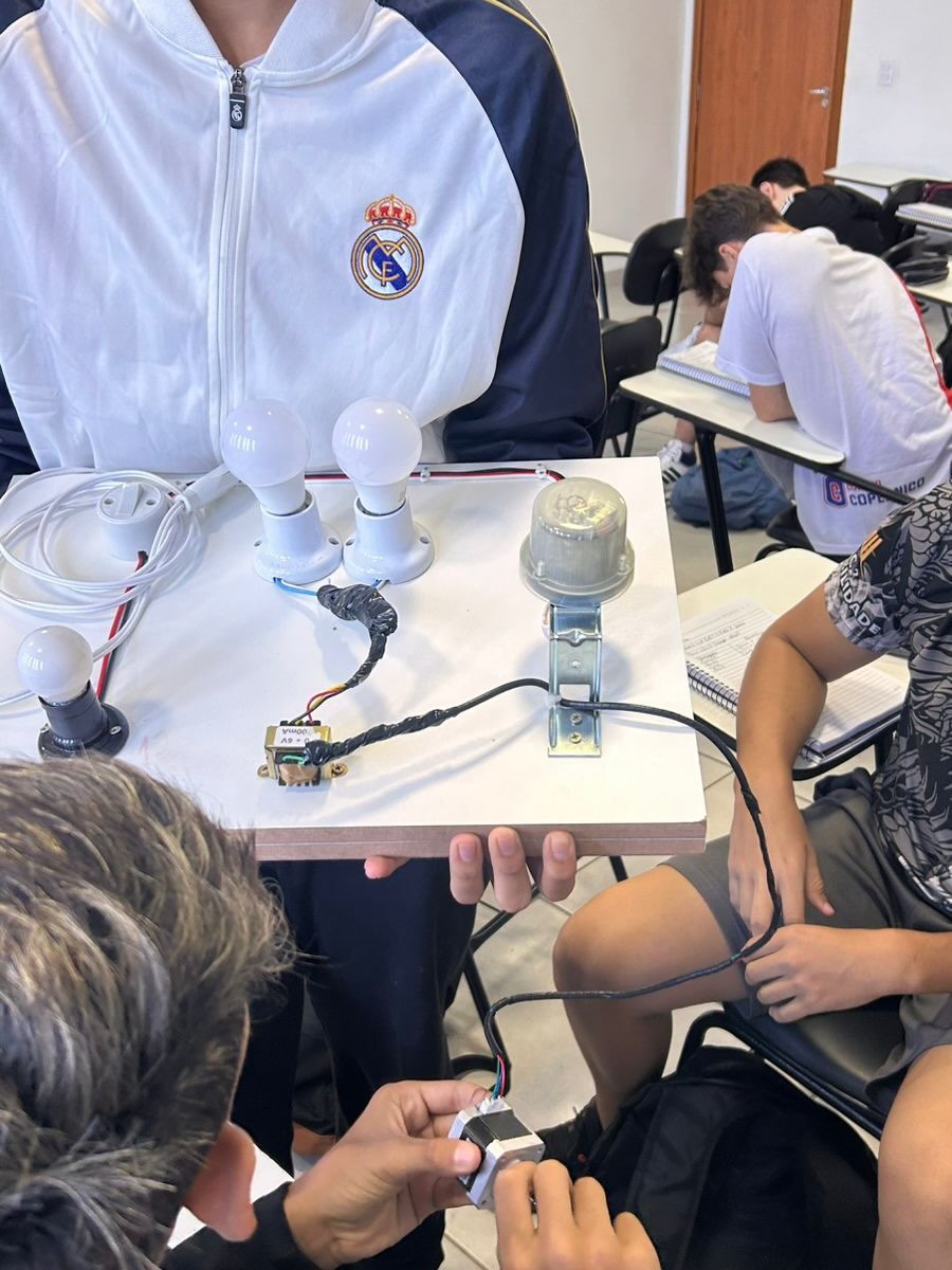 Na sequência, os estudantes aprofundaram os conhecimentos sobre o conceito de Física, suas características e sua relação com a tecnologia e a sustentabilidade. A aprendizagem foi reforçada por meio de atividades práticas, incluindo a geração de energia solar com o uso de uma placa fotovoltaica e a geração de energia elétrica com um pequeno gerador, possibilitando a visualização do funcionamento em tempo real.